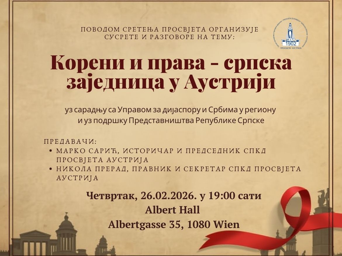 Поводом празника Сретења – дана државности Републике Србије, са задољством вас позивамо на Просвјетине “Сусрете и разговоре” у четвртак, 26. фебруара од 19:00 часова у свечаној сали Albert Hall, на адреси Albertgasse 35, 1080 Wien.